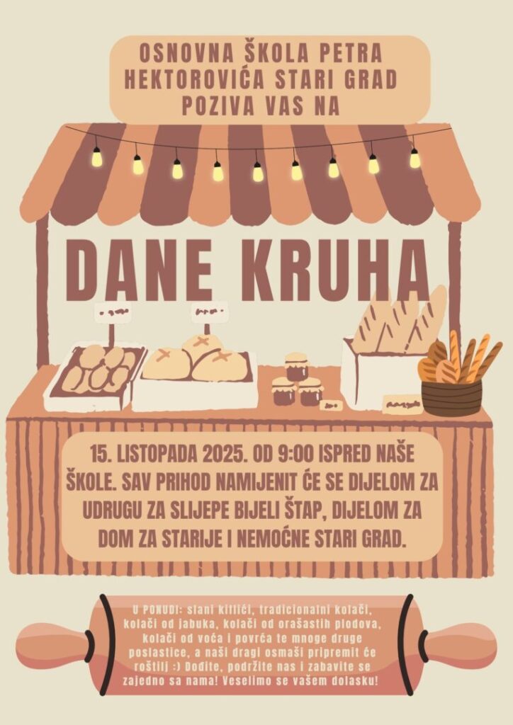 Osnovna škola Petra Hektorovića Stari Grad poziva vas u srijedu, 15. listopada od 9:00 ispred naše škole na Dane kruha. Sav prihod namijenit će se dijelom za udrugu za slijepe Bijeli štap, dijelom za Dom za starije i nemoćne Stari Grad. U ponudi imamo slatke i slane kiflice, tradicionalne kolače, kolače od jabuke, kolače od orašastih plodova, kolače od voća i povrća te mnoge druge poslastice, a naši dragi osmaši pripremit će roštilj.