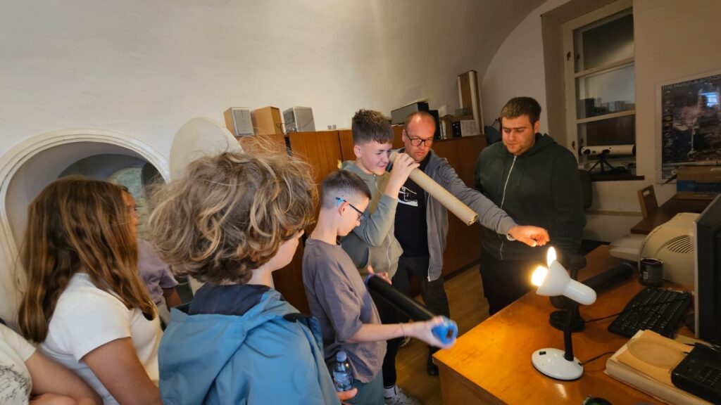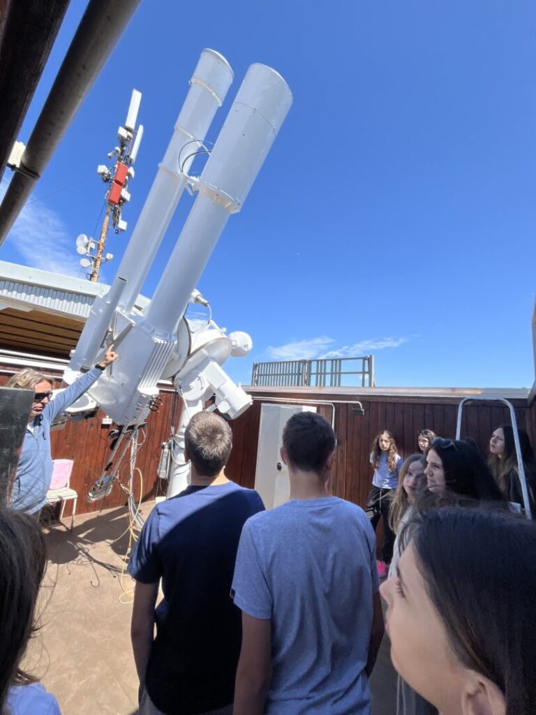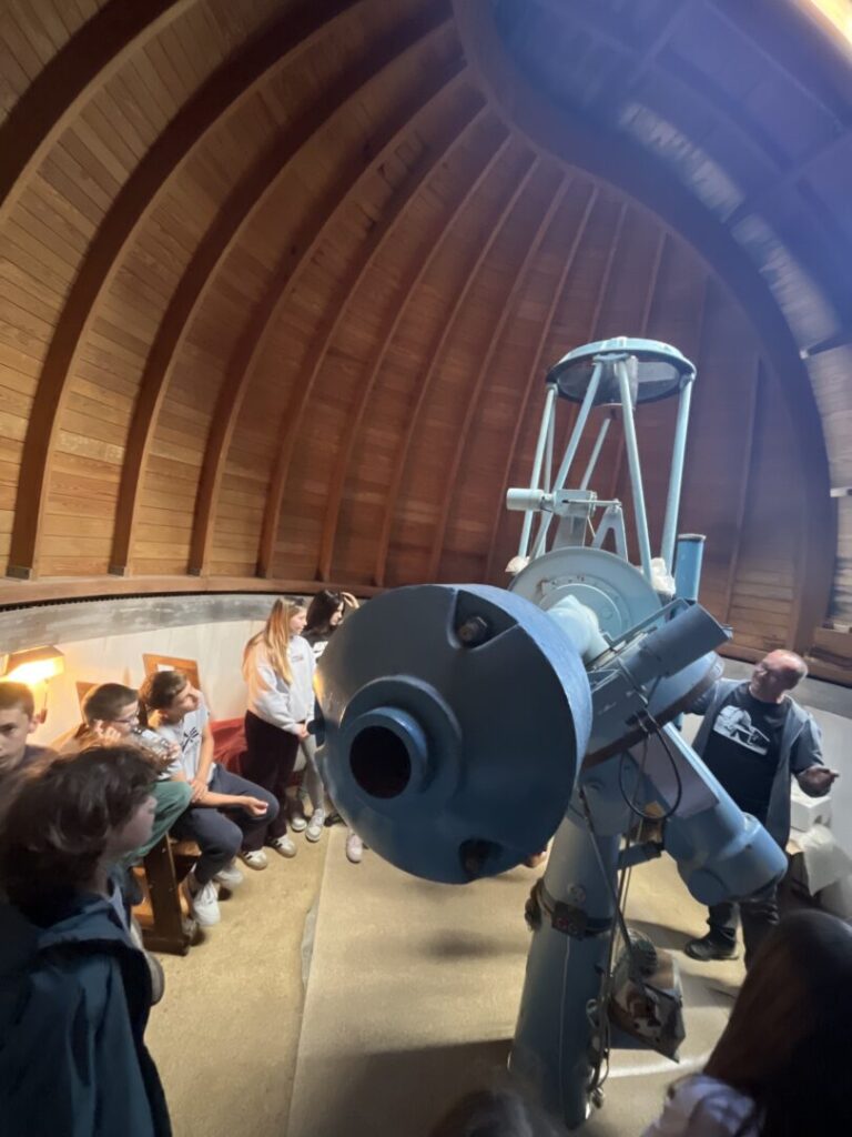 U podnožju zvjezdarnice učenici su uz pratnju tehničara g. Tonija Viskovića posjetili dvije kupole unutar kojih je smješten austrijsko – hrvatski teleskop, koji se sastoji od dvaju zrcala te se koristi za promatranje otvorenih skupova i promjenjivih zvijezda. Na kraju su se upoznali i sa najstarijim reflektorskim stelarnim teleskopom kojem je zadaća promatranje promjenjivih zvijezda pomoću fotometrije. Učenici su se upoznali sa pojmom “luminozitet” zvijezde (snaga zračenja ili sjaj nebeskih tijela) i površinskom temperaturom zvijezda kojima se određuje starost i vrsta zvijezda. Učenici su s pažnjom slušali izlaganja, postavljali pitanja i znatiželjno obilazili opservatorij te su uživali u prekrasnom pogledu koji se pruža na grad Hvar, hvarski i viški kanal s Paklenskim otocima te pučinskim otocima Sušac, Vis , Sv. Andrija i Brusnik.