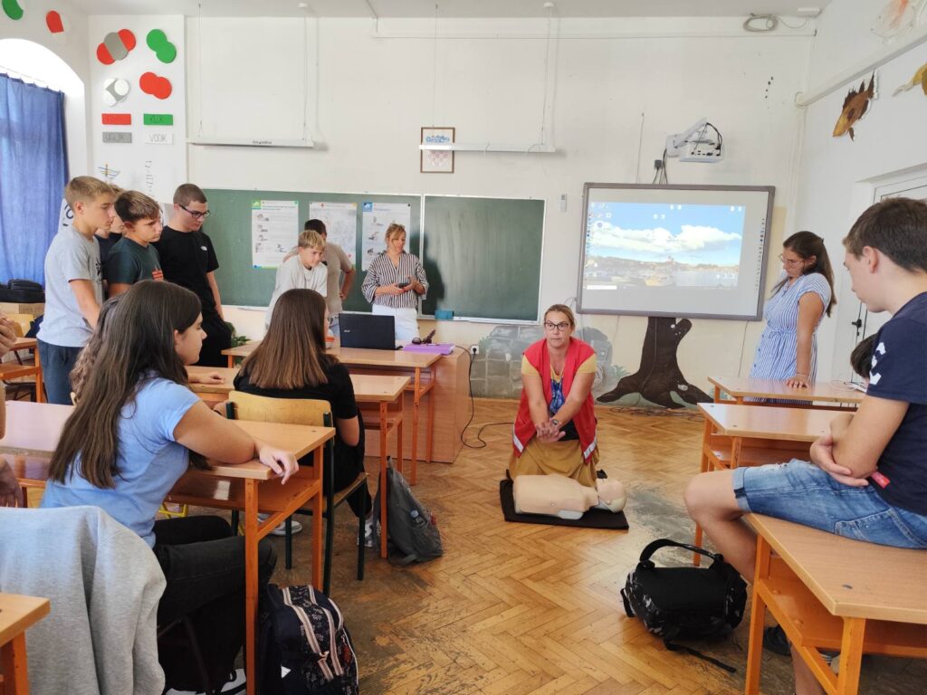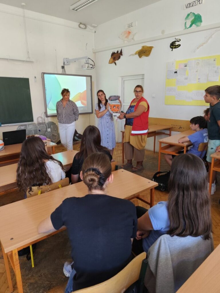 te upoznavanje s radom defibrilatora. Učenici su s pažnjom pratili izlaganje te aktivno sudjelovali